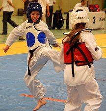 Kinder und TAEKWONDO = Selbstverteidigung - leider ein sehr aktuelles Schlagwort. Jedes Mädchen und jeder Junge kann sich verteidigen. Selbstverteidigung beginnt im Kopf und nicht bei den Techniken. Viele Leute haben falsche Vorstellungen von Selbstverteidigung und glauben, dass man ein Experte in einer Kampfsportart sein muss, um sich zu verteidigen. Selbstverteidigung beginnt zu 90 % in der Einstellung und der Entschlossenheit des Kindes. Es gibt natürlich keine Patentrezepte in der Selbstverteidigung, sondern möglichst vielseitige Techniken, die mit einem Partner geübt werden und dem Kind das nötige Selbstvertrauen vermittelt. Als Taekwondokas bringen die Kinder bereits wichtige Grundlagen mit. Taekwondo fordert die Kinder nicht nur körperlich, sondern auch geistig heraus. Es lehrt sie, schnell zu reagieren und eine Sache konzentriert und mit vollem Einsatz zu Ende zu bringen. Hier wird jeder gefordert und kann seine überschüssige Energie abbauen. Außerdem werden motorische Fähigkeiten gefördert. Die Kinder gewinnen Vertrauen in Ihre eigenen Fähigkeiten und Kräfte und damit an Selbstbewusstsein. Sie erkennen Zusammenhänge zwischen Ihrer Körpersprache, Ihrem Auftreten und der damit verbundenen Wirkung auf andere. Auch der WEISSE RING sagt: "Ein starkes, selbstbewusstes Kind entspricht weniger dem Opferprofil. Die Gefahr, dass es als Opfer ausgesucht wird, ist geringer".